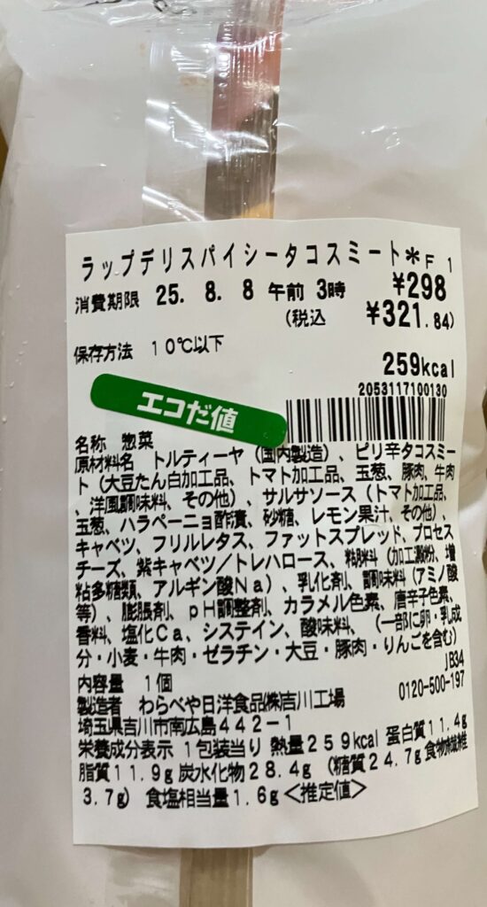 タコスミート、サルサソース、チェダーチーズ、野菜(レタスなど)をトルティーヤで巻いたラップタイプの惣菜