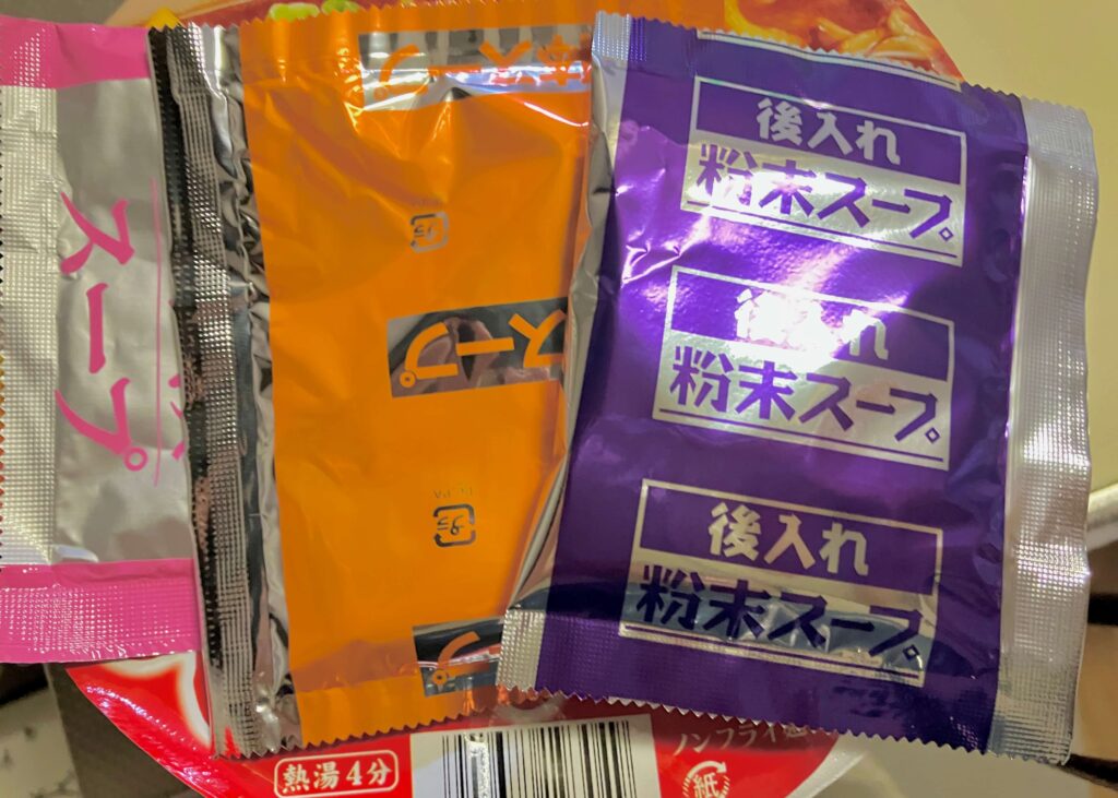中身はかやく、後入れ粉末、後入れ液体スープの3つ!